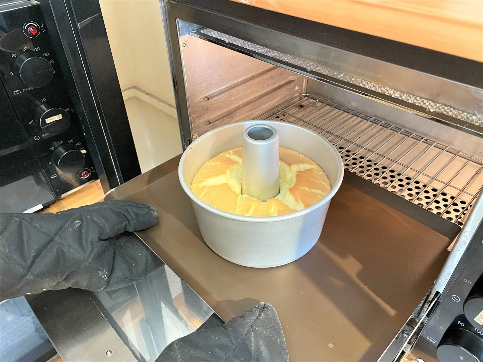 將麵糊倒入模具中再放入事先預熱好的烤箱裡!切記一定要帶手套,注意安全!
